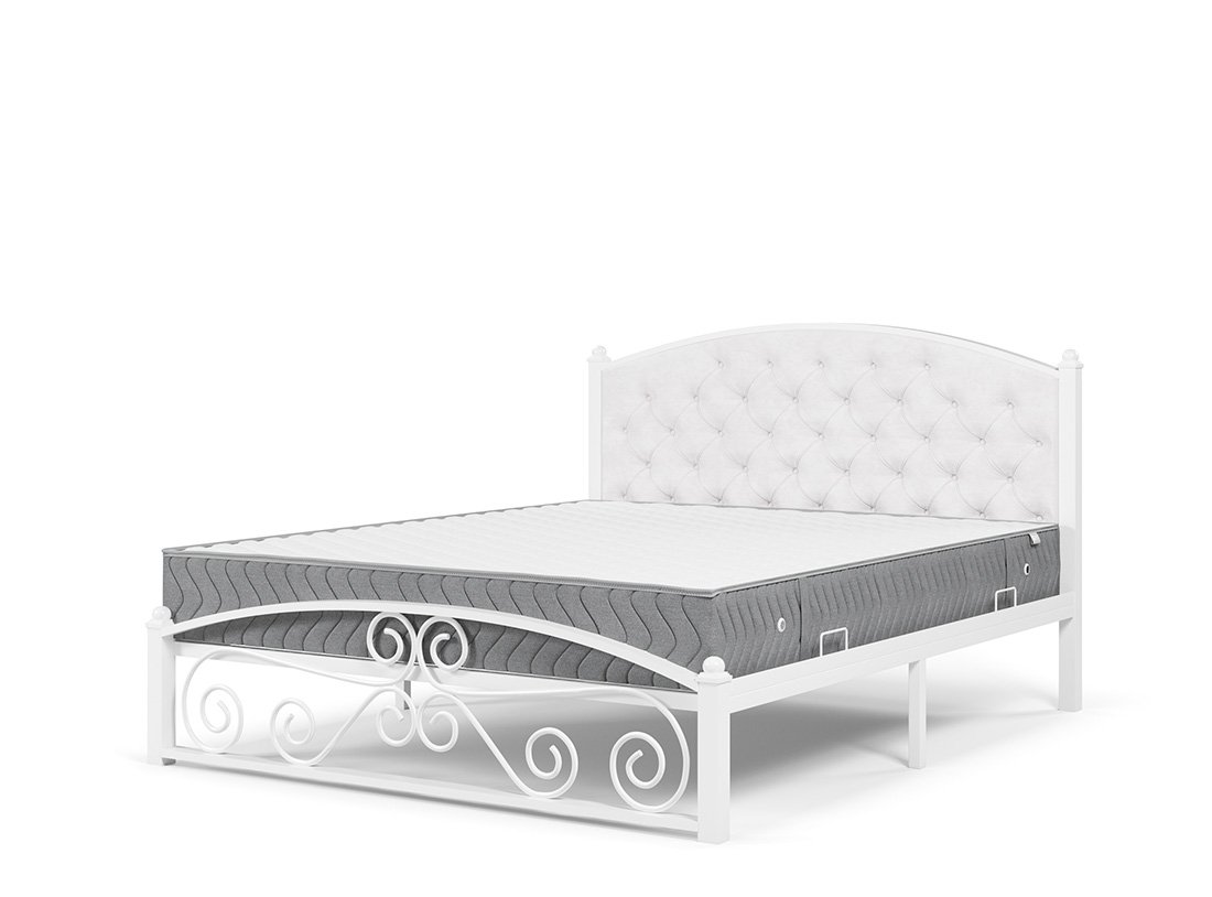 Кованая металлическая кровать Диана с мягким изголовьем — прекрасный выбор для комфортного сна. Особую неповторимость облику кровати придает каретная стяжка изголовья и декоративные элементы изножья. Материал изголовья: экокожа либо велюр Ares. К ней отлично подойдет матрас ЭОС Тип 5а.