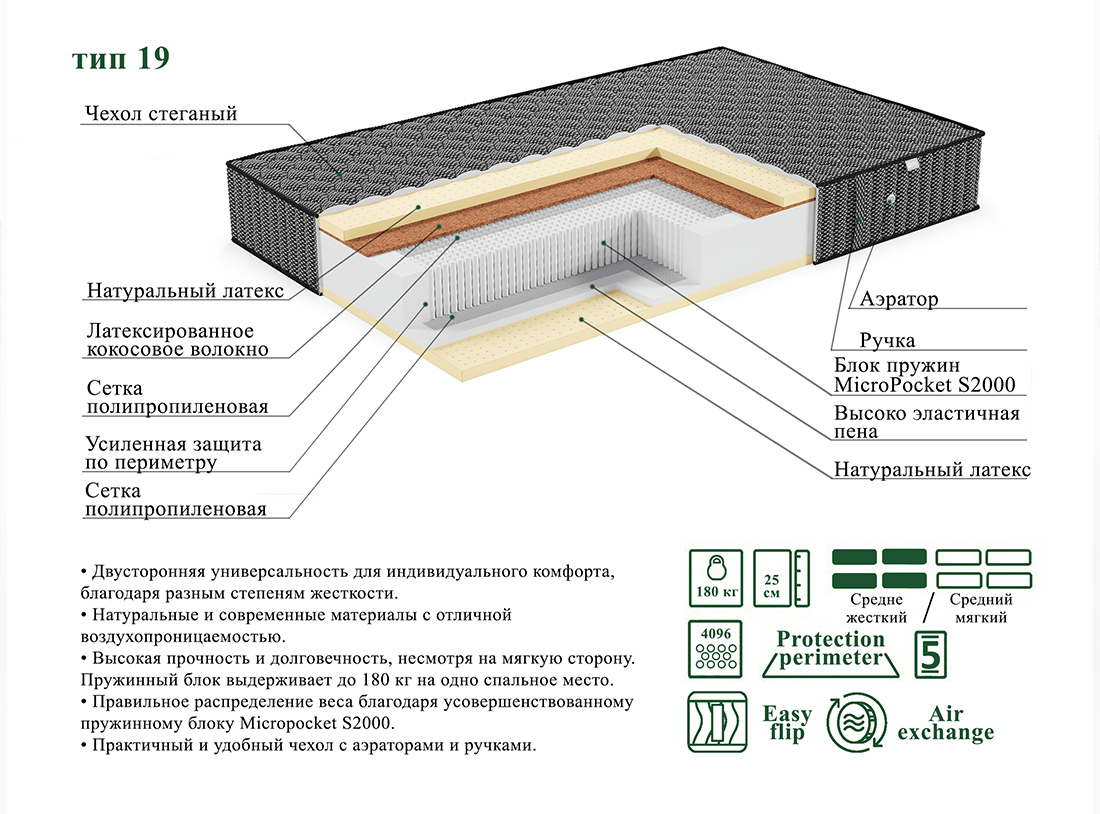 Инновационный пружинный блок MicroPocket S2000 с 1024 пружинами на квадратный метр. Этот блок не только подстраивается под ваши контуры, но и реагирует на каждое движение, обеспечивая идеальную поддержку. С нагрузкой до 180 кг на спальное место.
